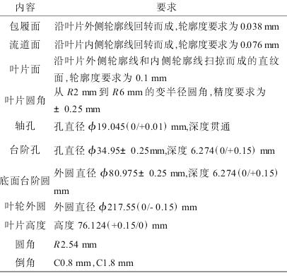 本文所研究整體葉輪零件圖樣如圖1所示,該葉輪為半開放式整體葉輪,葉片數(shù)量為17,是某離心式空氣壓縮機的核心零件,葉輪三維結構如圖2所示。該葉輪結構比較復雜,葉片扭曲程度比較高,主要有葉片、流道、圓角、孔等特征。葉輪的主要加工難點為葉片面、流道面和葉根圓角,此位置加工時容易產生干涉,并且只能采用小刀具加工,效率低,葉輪內孔尺寸要求以及內孔與葉輪外輪廓的同軸度要求都比較高,零件主要加工內容如表1所示。