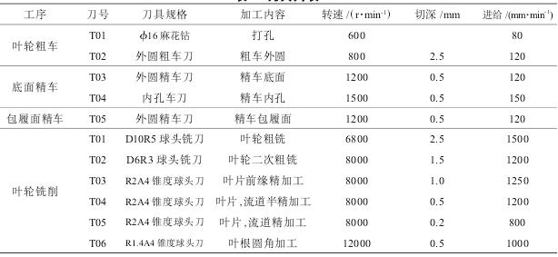 三爪夾盤夾持,完成葉輪底面臺階圓、臺階孔精車;第3次裝夾采用三爪夾盤和軟爪夾持,完成葉輪孔和輪轂的精車;第4次裝夾采用專用夾具夾持,完成葉輪銑削加工。工藝路線制定如下:1)備料。0Cr17Ni4Cu4Nb棒料,尺寸為220 mm×95 mm。2)打孔。在數(shù)控車床上用三爪夾盤夾持,打孔直徑為16 mm,深度貫通。3)粗車。粗車葉輪輪轂面,留2 mm精車余量。4)精車葉輪底面。在數(shù)控車床上零件掉頭,用三爪夾盤夾持,精車葉輪底面臺階外圓和臺階孔。5)精車葉輪包履面。在數(shù)控車床上用三爪夾盤和軟爪夾持。葉輪底面臺階外圓,精車內孔和輪轂面。6)葉輪粗銑。在五軸聯(lián)動加工中心上用專用夾具夾持,粗銑葉輪,流道方向和葉片方向各留0.5 mm精銑余量。7)粗銑葉片前緣。粗銑葉片前緣,留0.5mm精銑余量。8)葉片半精加工。半精加工葉片,葉片方向留0.2 mm精銑余量,流道方向留0.5 mm精銑余量。9)流道半精加工。半精加工流道,流道方向留0.2 mm精銑余量,葉片方向留0.5 mm精銑余量。10)葉片精加工。精加工葉片至零件圖樣要求。11)流道精加工。精加工流道至零件圖樣要求。12)葉根圓角精加工。精加工葉根圓角至零件圖樣要求。